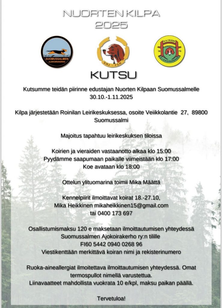 Ilmoittautuminen Nuorten Kilpaan auki 26.10.2025 saakka. Kerhon hallitus valitsee lähtijät, ensikertalaiset etusijalla. Houkutelkaapa nuoria mukaan!