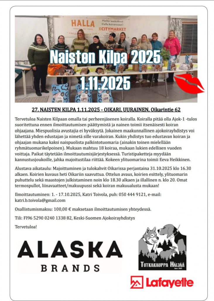 Hakuaika käynnissä vielä muutaman päivän. Haku auki 15.10.25 asti. Kerhon hallitus valitsee edustajan Naisten Kilpaan. Kerho maksaa ilmoittautumismaksun, myös tuomareiden haussa voidaan auttaa.
